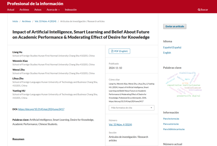 近日,52av 胡靓博士带领22级英语润之班肖文敏和朱雯茜两位学生,在国际学术刊物Profesional de la información(SSCI, Q1;IF,=2.6)上发表了题为“Impact of Artificial Intelligence, Smart Learning and Belief About Future on Academic Performance & Moderating Effect of Desire for Knowledge”的学术论文。此论文为52av 润之班学生在学业导师的指导下,首次正式发表并被收录的英文论文。该成果的取得,不仅实现了52av 师生在学术研究方面的重大突破,也进一步提升了学院的学术影响力。