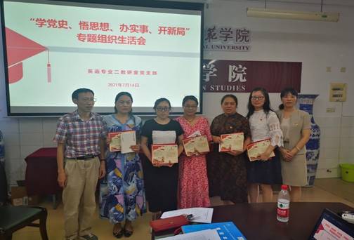 2021年7月14日下午,英语专业二教研室党支部在党总支的指导下召开了“学党史、悟思想、办实事、开新局”专题组织生活会。党支部书记胡启海主持会议,党总支书记李亚林、副书记杨虎智到会指导,并与支部成员一起,围绕主题交流学习体会。