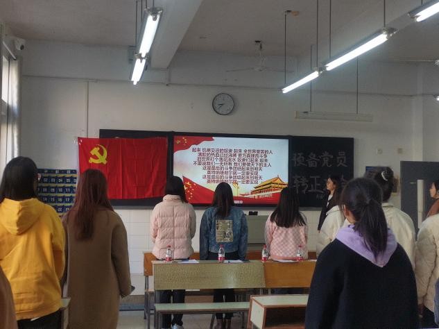 会议开始,全体成员起立合唱《国际歌》。随后进行监票人和计票人的表决,表决通过。接下来进行预备党员汇报思想情况,并提出转正申请。