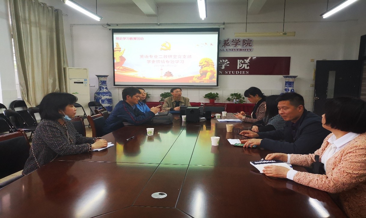 2021年4月20日下午,英语专业二教研室党支部在怀中北206会议室开展“学史增信”专题学习会。会议由支部书记胡启海主持,英语专业二教研室党支部全体党员参加。