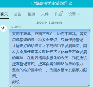 活动开展期间,全体党员踊跃发言,纷纷在线上交流学习心得。“安而不忘危,存而不忘亡,治而不忘乱。居安思危强调的是一种安全意识,只有保持警惕,才能更好的珍惜来之不易的和平发展局面。我们应该提高警惕意识,提高自己辨别网络信息的眼力,坚定地维护国家统一,为国家繁荣发展献力献策。”参与活动的学生党员彭乐表示。