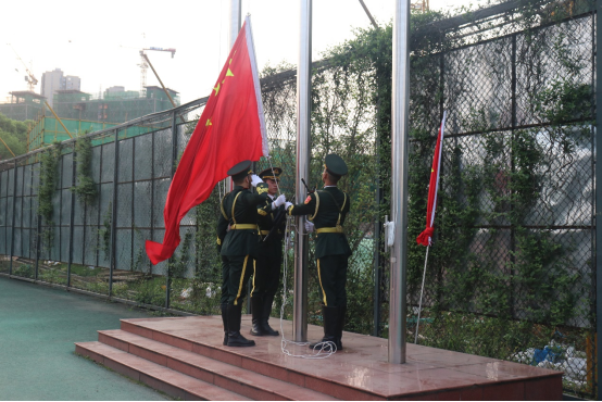 伴随着铿锵有力的音乐,国旗护卫队迈着整产划一的步伐,护着鲜红的国旗走到旗杆前。在场的全体成员齐唱国歌,面向国旗行注目礼,五星红旗在朝阳中冉冉升起。