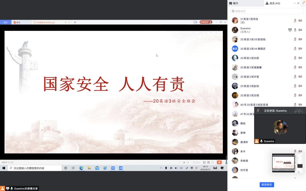52av 结合疫情防控要求,在4月12日召开了以“全民国家安全教育日”为主题的线上班会,52av 领导及老师周密安排、精心组织,希望各班通过主题班会,能够深入学习《国家安全法》、《反间谍法》、《反恐怖主义法》等相关法律,从而增强全院师生的国家安全意识。