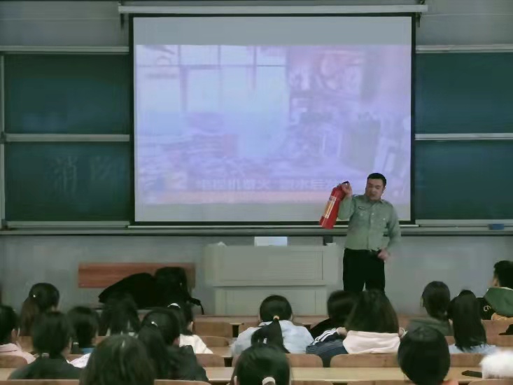 下午2点整,消防应急演练活动正式开始。所有参与人员在怀中南207教室聆听了谷教官主讲的消防安全知识讲座。首先,谷教官从火场逃生方面,向同学们强调一定不能跳楼逃生,应用连续对折三次的湿毛巾捂住口鼻,从未被火焰波及的一侧楼梯降低重心逃生。紧接着,教官通过PPT和视频的呈现,展示了几种错误的灭火方式,如用嘴吹、扇风、泼水灭电器起火等,普及了不同种类起火的灭火方法,并展示了灭火器的正确使用方式,同学们受益匪浅。