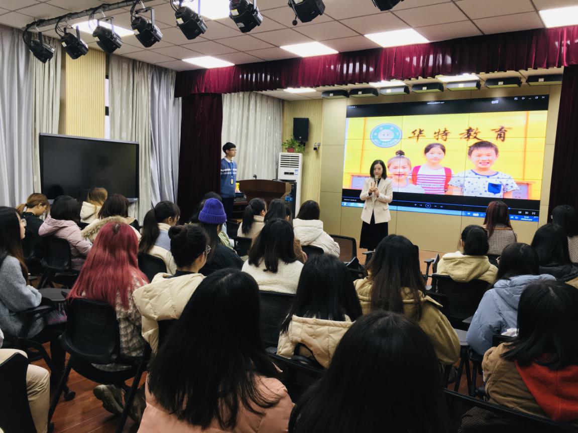 3日上午,在怀中北605教室,华特教育集团通过宣传片播放、ppt展示等方式向同学们介绍了公司的概况、职业发展方向、人员需求等,随后,35名有意向的同学与招聘人员进行了深入的沟通。经过面试、专业口试、微课展示等环节,最终,8名同学与华特教育集团成功签约。