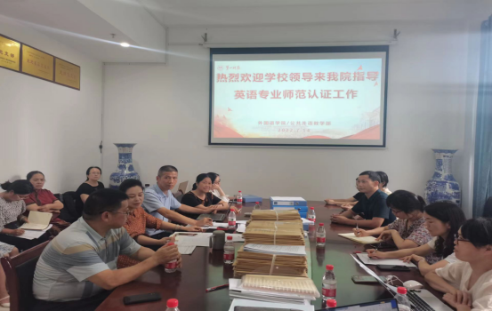 2022年7月14日下午,校党委书记罗成翼、党政办主任任晓晴、教务处长胡春光等领导来52av /公共外语教学部指导英语专业师范认证工作,看望慰问52av 英语专业师范认证工作暑期加班人员。