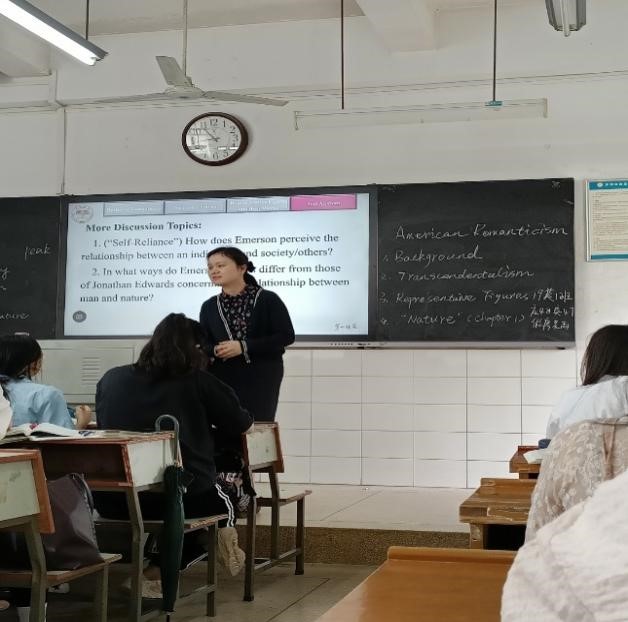 本次示范课主讲人为英美文学课程方向欧丽萍博士,她以“American Romanticism”为授课主题,从英国浪漫主义文学特征切入,通过问题导向,引导学生理解“What are the uniqueness of American Romanticism?”,从而引出美国浪漫派文学的顶峰思想“Transcendentalism”,紧接着,欧博士以“Nature”第一章的文本为切入口,再次通过问题导入,来引导学生对该文本进行细读,集中探讨Ralph Waldo Emerson的思想是如何通过其作品呈现出来的。欧博士在其授课过程中,有意识地将中国儒家、道家哲学与超验主义思想进行比较、融通,达到了思政“润物细无声”的效果。