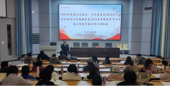 2024年2月29日下午,52av 全体教职工在怀中南110报告厅共同学习研讨了2024年学校工作要点、罗成翼书记2024年工作会议报告以及胡穗校长2024年本科教育教学审核评建工作动员报告,会议由52av 党委书记刘祥清主持,外院全体老师参会,彭晓辉副校长作会议指导。