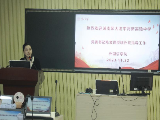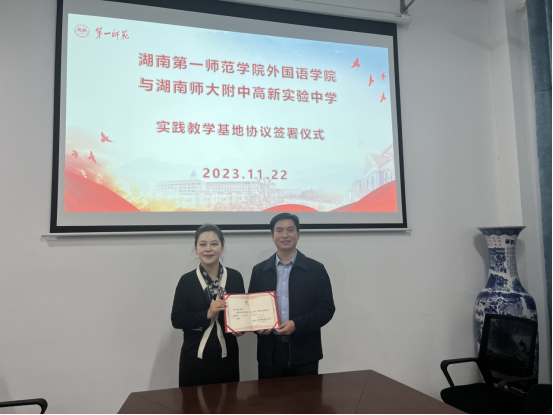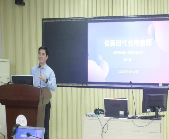 2023年11月22日下午,应52av 邀请,湖南师大附中高新实验中学党委书记陈文锋在怀中北602做题为"做新时代合格教师"的专题讲座。讲座之前,双方举行了实践教学基地协议签署仪式,52av 陈圣白副院长(主持工作)给陈文锋书记颁发了校外实践导师聘书。出席本次仪式的还有湖南师大附中高新实验中学罗秀琴主任、院党委书记刘祥清、教科办主任廖爱秀、学工办主任刘洁、辅导员陈蓓。22级英语卓越班、23级英语“润之英才”班全体同学参加了讲座。讲座由陈圣白主持。