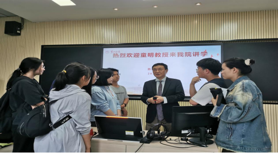 童明教授的讲座首先提出了“悲剧因何引起愉悦感”的问题。他从亚理士多德对悲剧情感的论述入手,指出著名的“怜悯和恐惧”悲剧情感假说无法充分解释悲剧快感的来源,故提出“悲剧的本质不是“悲惨”而是“力量”,是人站立在天地之间直面命运的严酷而毫不畏惧的“力量”。童明教授从希腊悲剧对酒神的崇拜谈到尼采的悲剧理论,从《哈姆雷特》、《麦克白》中的独白,谈到《八月之光》和沃尔夫《达洛维夫人》,引经据典,侃侃而谈,引起了学生们强烈兴趣。讲座后,师生就尼采超人哲学、海明威作品中的悲剧等话题与童明教授互动交流。