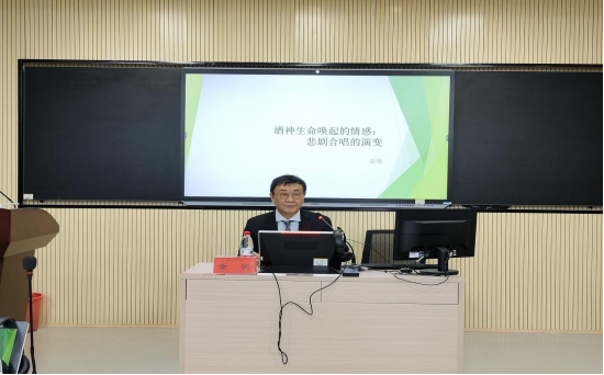 2024年4月26日晚19点至21点半,一师讲堂285期在52av 怀中北602教室隆重举行。本期讲堂由著名英美文学专家童明主讲,讲座的主题是“酒神生命唤起的情感:悲剧合唱的演变”。讲座由副院长王佳娣主持,来自长沙学院、我校52av 及机关处室的部分教师,22级和23级润之英才班学生等共80余人聆听了本次讲座。