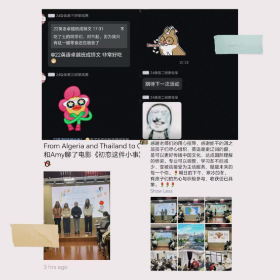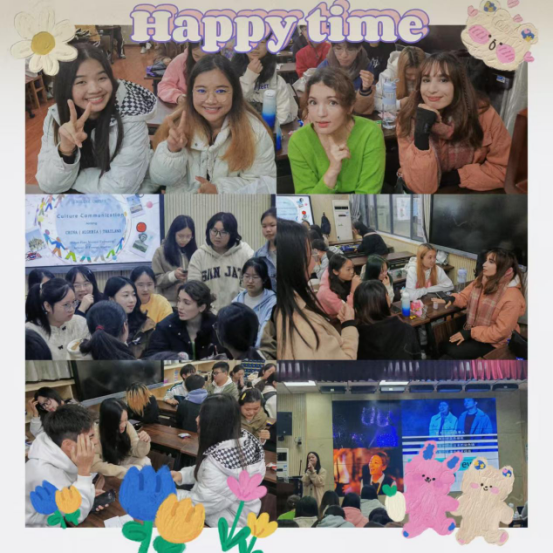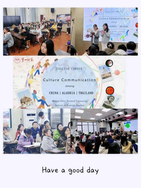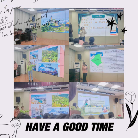 本次英语角的主题为“缤纷中国,多彩世界”。活动伊始,两位主持人邀请在座的同学上台参与趣味横生的热身游戏,瞬间点燃了现场气氛。紧接着进入主旨分享环节,来自阿尔及利亚的Lylia和Rania两位同学,结合视频剪辑与PPT,从地理环境、历史变迁到服饰美食等多维度,生动展现了她们国家的文化风貌;随后,泰国的Suwara和Amy两位同学也通过图文并茂的方式,为大家带来了泰国文化的深度解读,并现场教授了泰语基础问候语,四位同学都热情洋溢地邀请大家未来能亲身体验他们丰富多彩的异国文化。
