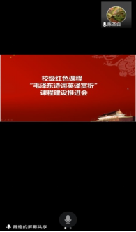 2022年7月31日晚20点至21点,52av /公共外语教学部《毛泽东诗词英译赏析》课程团队召开线上会议,就红色课程建设进行研讨。陈圣白副院长(主持工作)及课程团队所有成员参会,会议由魏艳主持。